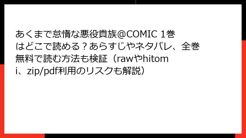 こんにちは、漫画ファンの皆さん! 2025年4月1日に発売されたあくまで怠惰な悪役貴族@COMIC 第1巻(原作:イコ、作画:セロタ、TOブックス・コロナ・コミックス)は、ユニークな転生ファンタジーで話題沸騰中です。しかし、無料で読めるからと、raw、hitomi、zip、pdf、漫画バンクなどの海賊版サイトを利用しようと考えている方もいるかもしれません。今回は、これらの海賊版サイトを利用して本作を読むことのリスクを、ブログ記事形式で詳しく解説します。法的問題からセキュリティの危険まで、