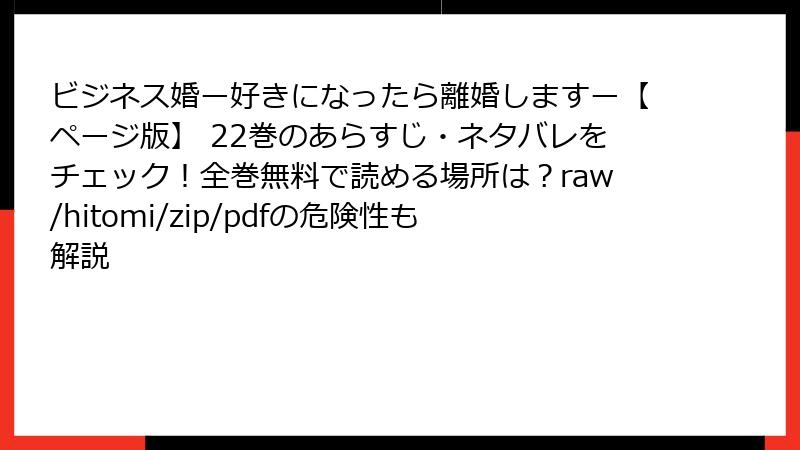 「ビジネス婚ー好きになったら離婚しますー【ページ版】」の22巻は、契約結婚を軸に展開する恋愛漫画の最新章として、読者の心を掴むドラマチックな展開が満載です。この記事では、22巻のネタバレ情報を詳細に解説し、主要なエピソード、キャラクターの行動、感情の変化、そして物語の核心となる衝撃的なシーンを掘り下げます。ネタバレ全開のため、未読の方はご注意ください! ページ版の鮮やかなビジュアルとともに、物語の山場をブログ形式でたっぷりお届けします。さっそく、22巻の全貌を見ていきましょう!