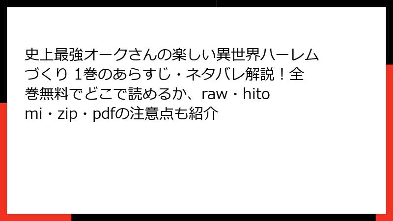 『史上最強オークさんの楽しい異世界ハーレムづくり』1巻は、月夜涙氏のライトノベルを原作に、月見隆士氏が漫画化した異世界ファンタジー。オークの最強種族としての力を活かし、ハーレムを目指す主人公オルクの冒険が始まる本作は、コミカルな展開と魅力的なキャラクターが織りなす物語が魅力です。この記事では、1巻のネタバレを詳細に掘り下げ、物語の展開やキャラクターの成長を徹底解説します。以下、ネタバレ全開で進めますので、未読の方はご注意ください!