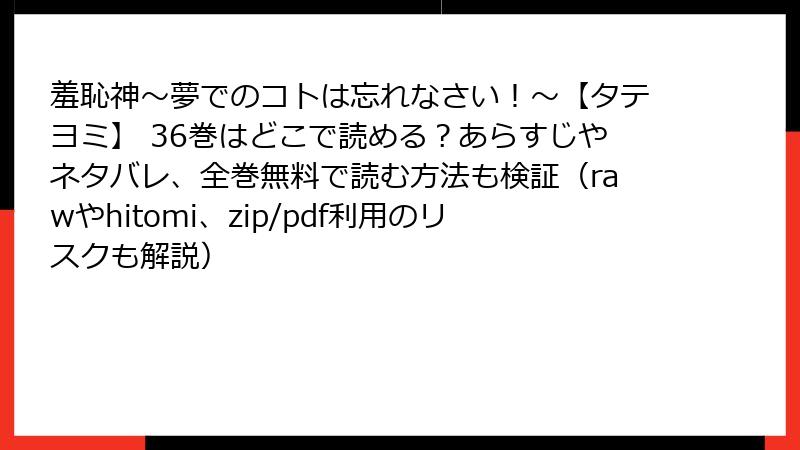 raw/hitomi/zip/pdf/漫画バンクなどの海賊版サイトは、法的罰則、ウイルス感染、経済損失、社会的影響という多大なリスクを伴います。一時的な無料の魅力に惑わされず、正規ルートを選ぶのが賢明です。『羞恥神~夢でのコトは忘れなさい!~』36巻のような魅力的な作品を、作者の努力を尊重して楽しみましょう。リスクを理解し、安全第一で漫画ライフを満喫してください!