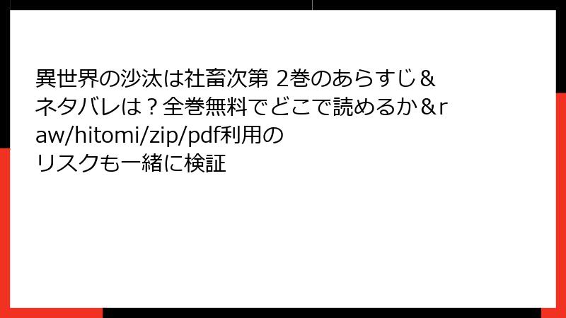 『異世界の沙汰は社畜次第』は、ユニークな設定と魅力的なキャラクターで多くのファンを惹きつけています。しかし、海賊版サイトの利用は、法的なトラブル、個人情報の危険、業界へのダメージなど、取り返しのつかないリスクを伴います。好きな作品を長く楽しむためにも、正規の方法で読むことが大切。2巻の教会改革やアレシュの過保護なシーンを、クリアな画質と正確な翻訳で味わいたいですよね! 漫画ファンの一人として、作者や業界を応援しながら、安全に楽しむことをおすすめします。次回のブログもお楽しみに!