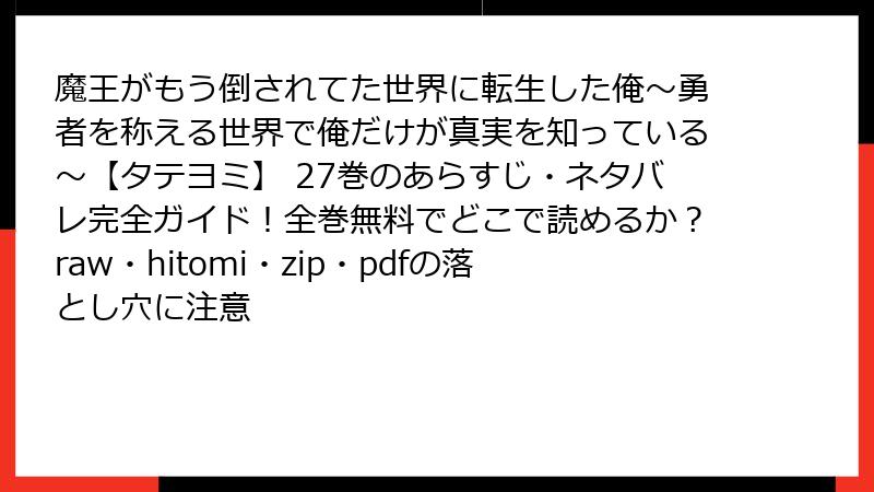 こんにちは、異世界転生漫画をこよなく愛するブロガーです! 今回は、「魔王がもう倒されてた世界に転生した俺~勇者を称える世界で俺だけが真実を知っている~【タテヨミ】」の27巻の詳細なネタバレをお届けします。この作品は、勇者の神話に疑問を抱く転生者・俺の孤独な戦いが魅力のファンタジー漫画です。27巻は物語の転換点で、衝撃の展開と伏線回収が満載! タテヨミ形式の読みやすさと美麗なイラストも健在です。本記事は完全なネタバレを含むため、未読の方はご注意ください。さっそく、27巻の核心に迫る内容をブログ形式で解説します!