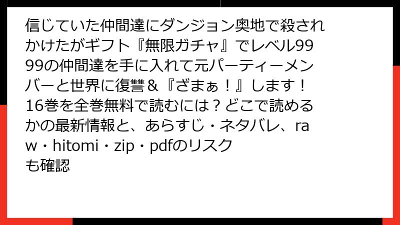 信じていた仲間達にダンジョン奥地で殺されかけたがギフト『無限ガチャ』でレベル9999の仲間達を手に入れて元パーティーメンバーと世界に復讐&『ざまぁ!』します! 16巻を全巻無料で読むには?どこで読めるかの最新情報と、あらすじ・ネタバレ、raw・hitomi・zip・pdfのリスクも確認