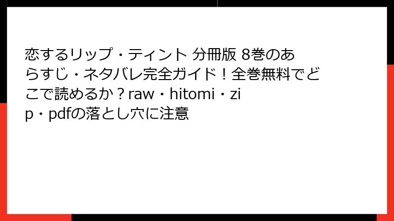 こんにちは、マンガ大好きブロガーのあかりです! 前回は『恋するリップ・ティント 分冊版 8巻』のネタバレを熱く語りましたが、今回は深刻なテーマにシフト。楠なな先生の素敵な作品を、rawやhitomi、zip、pdf、漫画バンクなどの海賊版サイトで読もうとするリスクを、詳しく掘り下げます。2025年9月現在、海賊版サイトの取り締まりが厳しくなっている中、無料で読みたい気持ちはわかりますが…本当に危険がいっぱい! 法的・セキュリティ・倫理的な観点から、読み応えある解説をお届け。未読の方も、合法ルートをおすすめしますよ。さっそく本題へ!