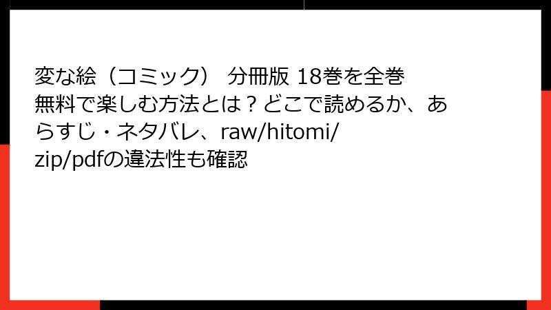 『変な絵(コミック) 分冊版』は、雨穴のホラー小説を原作とした人気のサスペンス・ミステリー作品で、相羽紀行の作画により多くの読者を魅了しています。しかし、このような人気作品は、raw、hitomi、漫画バンクなどの海賊版サイトで違法にアップロードされることがあります。これらのサイトで漫画を読むことは一見手軽に見えますが、重大なリスクが伴います。この記事では、『変な絵(コミック)』を海賊版サイトで読むことの危険性を、法的、倫理的、技術的な観点から詳しく解説します。読み応えのある内容にするため、複数の見出しと箇条書きや表を用いて整理します。