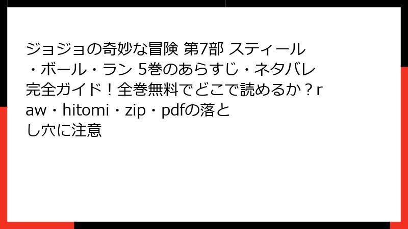 こんにちは、漫画好きの皆さん! 今日は、荒木飛呂彦先生の傑作『ジョジョの奇妙な冒険 第7部 スティール・ボール・ラン』のような人気作品を、raw、hitomi、zip、pdf、漫画バンクなどの海賊版サイトで読むことのリスクについて、深く掘り下げてお話しします。一見、無料で最新巻や全巻が手に入るように見えますが、実際には深刻な法的・セキュリティ・倫理的な問題が潜んでいます。このブログ記事では、複数のセクションに分けて詳しく解説。まだ海賊版サイトに手を出していない方も、これを読んで正しい読み方を身につけましょう! ネタバレなしでリスクだけにフォーカスしますが、絶対に正規ルートをおすすめしますよ。