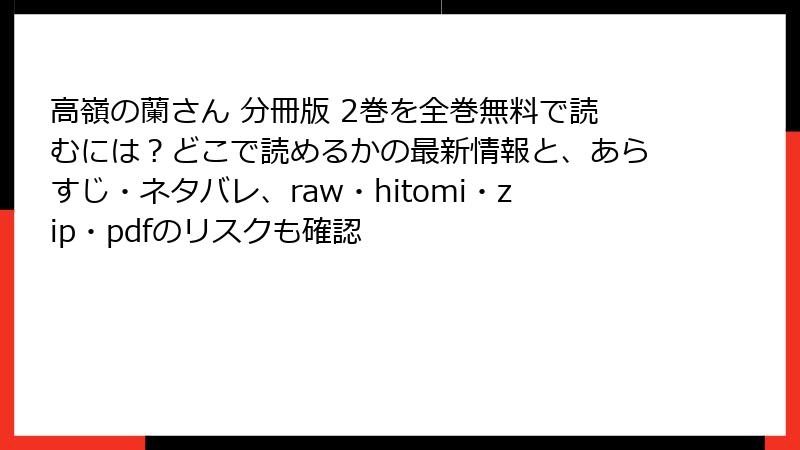 『高嶺の蘭さん 分冊版 2巻』をraw、hitomi、zip、pdf、漫画バンクなどの海賊版サイトで読むことは、法律的、倫理的、技術的なリスクを伴います。著作権侵害による法的責任、クリエイターや業界へのダメージ、マルウェアや個人情報漏洩の危険、品質の低さなど、デメリットは計り知れません。一方で、正規のプラットフォームを利用することで、安全かつ高品質な読書体験が得られ、好きな作品や作者を応援できます。2024年のデータによれば、海賊版サイトの利用は漫画業界に多大な損失を与えており、ファンとして正規ルートを選ぶことが、漫画文化の未来を守る一歩となります。 ぜひ、公式の書店やデジタルプラットフォームで『高嶺の蘭さん』を楽しみ、蘭と晃のピュアなラブストーリーを安心して堪能してください。