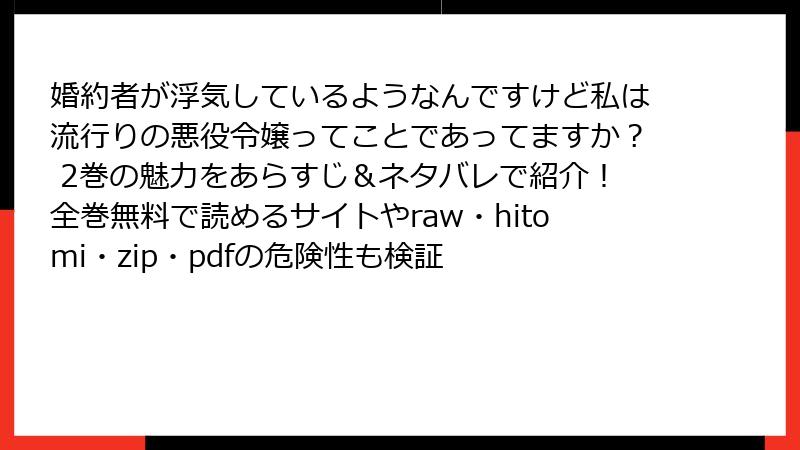 こんにちは、マンガファンの皆さん! 今日は、無料で最新の漫画を読みたいという誘惑に駆られがちな海賊版サイトについて、詳しくリスクを掘り下げてお話しします。この記事で取り上げるのは、「婚約者が浮気しているようなんですけど私は流行りの悪役令嬢ってことであってますか?」のような人気コミックを、raw、hitomi、zip、pdf、漫画バンクなどのサイトで読むことの危険性です。これらのサイトは一見便利に見えますが、法的・セキュリティ・倫理的な問題が山積みで、利用は絶対に避けるべきです。ブログ記事形式で、複数のセクションに分けて読み応えのある内容にまとめました。未読の方はネタバレなしで楽しめますが、まずは正規のルートをおすすめします。それでは、さっそく本題へ!