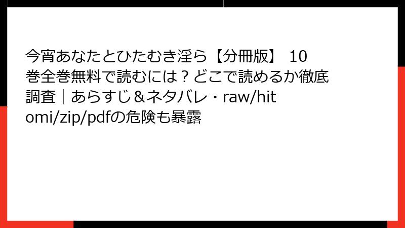 こんにちは、漫画好きの皆さん! 今日のブログでは、誰もが一度は気になってしまう『今宵あなたとひたむき淫ら【分冊版】』のような人気TL漫画を、raw、hitomi、zip、pdf、漫画バンクなどの海賊版サイトで読むことのリスクについて、深く掘り下げてお話しします。一見、無料で最新巻や全巻が手に入るように見えますが、これらのサイトは違法なだけでなく、深刻な危険が潜んでいます。法的問題からセキュリティ被害、倫理的な影響まで、具体的な事例を交えながら解説。読み応えのある内容に仕上げましたので、未読の方もリスクを理解して、正規ルートをおすすめします! では、さっそく本題へ。