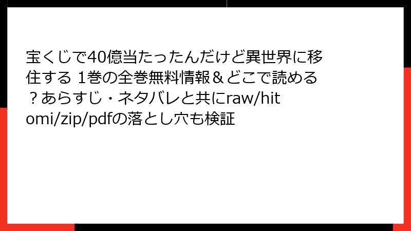 「宝くじで40億当たったんだけど異世界に移住する」は、すずの木くろによる原作小説を基にした、今井ムジイ作画のコミックです。原作は「小説家になろう」で人気を博し、コミカライズされた本作は、異世界ファンタジーと現代日本の要素を融合させたユニークな物語が魅力。この記事では、1巻のあらすじを詳しく解説し、物語の導入部分の魅力をお伝えします。主人公・志野一良(カズラ)が宝くじで手に入れた40億円を背景に、異世界でのスローライフと冒険を始める様子を、以下に詳しくまとめます。