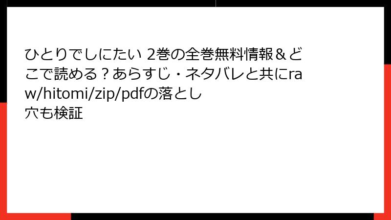 『ひとりでしにたい』は、カレー沢薫とドネリー美咲による人気の漫画で、終活をテーマにしたユニークなストーリーが多くの読者を魅了しています。しかし、このような人気作品を、raw、hitomi、zip、pdf、漫画バンクなどの海賊版サイトで読むことは、重大なリスクを伴います。海賊版サイトの利用は、無料で漫画が読めるという誘惑がある一方で、法的、倫理的、技術的な問題を引き起こす可能性があります。この記事では、こうしたサイトで『ひとりでしにたい』を読むことの具体的なリスクを、詳細に解説します。