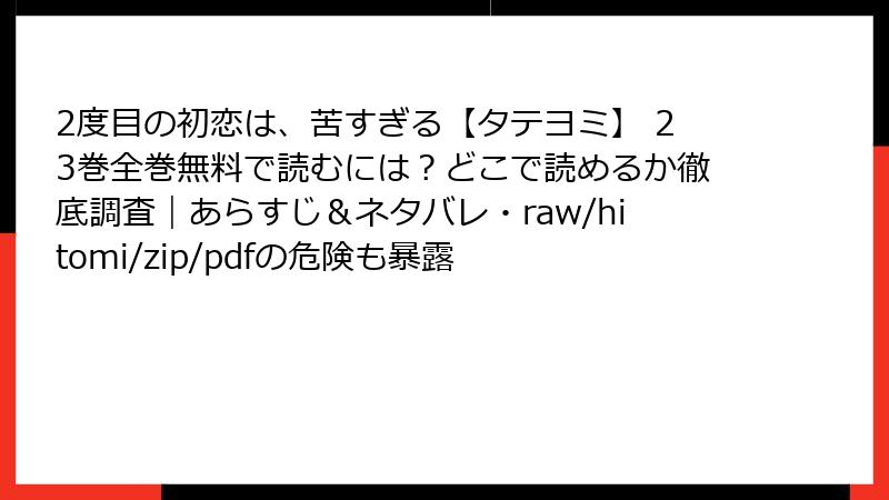 こんにちは、漫画愛好家のあかりです! 『2度目の初恋は、苦すぎる【タテヨミ】』は、切ない恋物語と美しいアートで多くのファンを魅了する中国発の人気タテヨミマンガです。しかし、この素晴らしい作品をraw、hitomi、zip、pdf、漫画バンクなどの海賊版サイトで読もうと考える方もいるかもしれません。今回は、こうした海賊版サイトを利用することの重大なリスクを、ブログ記事形式で詳しく解説します。無料で読める誘惑は魅力的ですが、その裏には多くの危険が潜んでいます。
