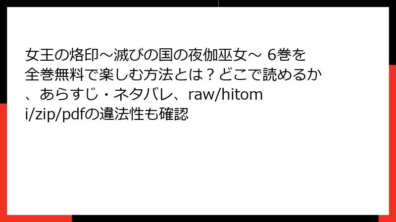 こんにちは、漫画ファンの皆さん! 『女王の烙印~滅びの国の夜伽巫女~』は、加藤キャシー先生によるエロティックホラーの傑作で、緋紋島の呪いと愛憎劇が織りなすスリリングな物語が魅力です。しかし、この人気作品を「raw」「hitomi」「zip」「pdf」「漫画バンク」などの海賊版サイトで読もうと考える方もいるかもしれません。今回は、そうした海賊版サイトを利用することの重大なリスクを、詳細かつ分かりやすく解説します。違法サイトの危険性を理解し、合法的に漫画を楽しむための意識を高めましょう。この記事は、ブログ形式で読み応えのある内容をお届けします!