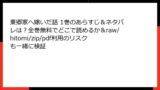 | マルウェア感染 | 海賊版サイトは、ウイルスやスパイウェアを仕込んだファイルを配布するケースが多い。zipやpdf形式のダウンロードは特に危険。 | 『東郷家へ嫁いだ話』のzipファイルをダウンロードした結果、PCがランサムウェアに感染し、データが暗号化された事例。 |