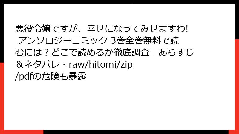 こんにちは、漫画愛好家のブログ管理人、悪ロリです! 『悪役令嬢ですが、幸せになってみせますわ! アンソロジーコミック 3巻』(一迅社、2020年3月27日発売)は、悪役令嬢の逆転劇が詰まった大人気アンソロジー。魅力的なストーリーと美麗な作画でファン心を掴むこの作品ですが、無料で読もうと「raw」「hitomi」「zip」「pdf」「漫画バンク」といった海賊版サイトに手を出してしまう人もいるかもしれません。しかし、こうしたサイトの利用には重大なリスクが潜んでいます。この記事では、海賊版サイトで漫画を読むことの危険性を、法的・倫理的・技術的な観点から詳しく解説します。読み応えのある内容で、