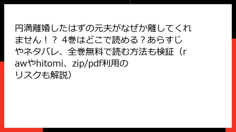 こんにちは、マンガファンの皆さん! 『円満離婚したはずの元夫がなぜか離してくれません!?』は、宮永レンさん原作、ごしょいもさん作画の胸キュン必至のラブストーリーで、Leo comicレーベルから出ている大人気作です。この作品を心から楽しみたいと思うのは自然なことですが、raw、hitomi、zip、pdf、漫画バンクなどの海賊版サイトで読もうとするのは危険がいっぱい! 今回は、海賊版サイトでこの漫画を読むことのリスクを、法的・倫理的・技術的な観点から詳しく解説します。ブログ記事形式で、読み応えのある内容をお届けしますので、ぜひ最後までチェックしてください。海賊版の誘惑に負けず、正規ルートでマンガを楽しむための知識を深めましょう!