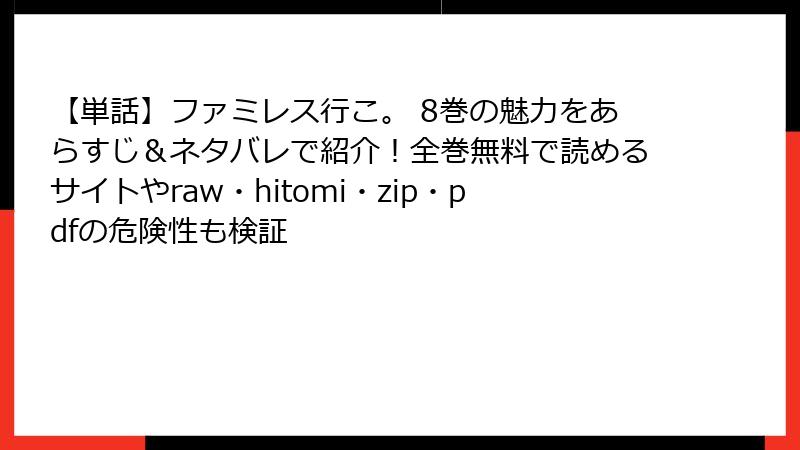 和山やまの人気漫画「ファミレス行こ。」は、そのユニークなユーモアと魅力的なキャラクターで多くのファンを惹きつけています。しかし、この作品をraw、hitomi、zip、pdf、漫画バンクなどの海賊版サイトで読むことは、無料で手軽に思える一方で、深刻なリスクを伴います。本記事では、これらの海賊版サイトを利用することの危険性を、法的、技術的、倫理的な観点から詳しく解説します。海賊版サイトの利用を検討している方は、以下の内容をぜひ参考にしてください。なお、この記事は2025年9月27日時点の情報を基にしています。