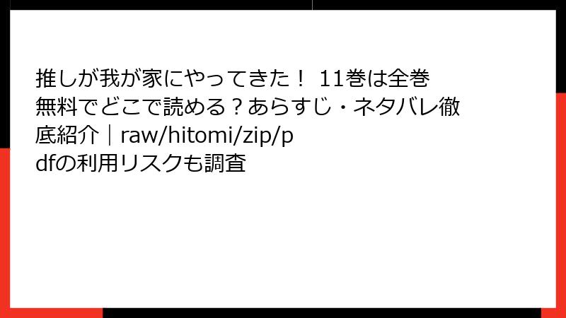 こんにちは、マンガ大好きだけど安全第一のブロガー、あかりです! 今日は、皆さんが気になりがちな『推しが我が家にやってきた!』のような人気コミックを、raw、hitomi、zip、pdf、漫画バンクなどの海賊版サイトで読むことのリスクについて、ガッツリ深掘りします。無料で最新巻にアクセスできるのは魅力的ですが、2025年現在、これらのサイトは法的・セキュリティ・倫理的な地雷原。利用者の被害事例が急増中で、軽い気持ちで訪れると取り返しのつかないトラブルに巻き込まれるかも…。この記事では、複数の視点からリスクを詳しく解説し、安全な楽しみ方を提案。読み応え抜群でお届けしますので、未読の漫画ファン必見ですよ!