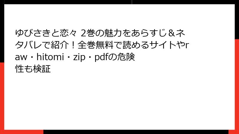 こんにちは、マンガ愛好家のあかりです! 今日は、森下suu先生の心温まる恋愛漫画『ゆびさきと恋々』を例に挙げつつ、海賊版サイト(raw、hitomi、zip、pdf、漫画バンクなど)で漫画を読むリスクについて、ガッツリ深掘りします。無料で読めるなんて魅力的? いえいえ、そんな甘い話じゃないんです。ウイルス感染から法的トラブル、業界の崩壊まで、想像以上の危険が待ち受けています。2025年現在、取り締まりも強化され、利用者の被害報告が急増中。ネタバレなしで楽しみたいなら、正規ルート一択! それでは、複数の角度からリスクを解説していきますね。あなたのデバイスと心を守るために、ぜひ最後まで読んでください♪