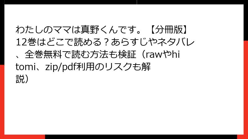 raw/hitomi/zip/pdf/漫画バンクなどの海賊版サイトは、無料の魅力の裏に法的罰金、ウイルス感染、情報漏洩、倫理的後悔という多大なリスクを隠しています。2025年の今、取り締まりは厳しく、被害事例はRedditやYahoo!知恵袋でも溢れかえっています。結論:絶対に避けましょう! 代わりに、正規の電子書籍サービス(例: 無料トライアル豊富な国内アプリ)を利用すれば、安全に『わたしのママは真野くんです。【分冊版】 12巻』を満喫できます。