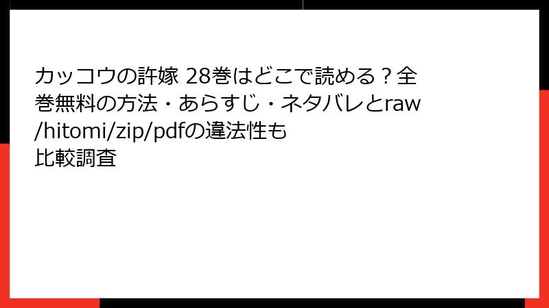 こんにちは、漫画ファンの皆さん! 『カッコウの許嫁』の28巻が発売され、体育祭編のドキドキ展開に心を奪われている方も多いはず。この人気ラブコメを少しでも安く、または無料で読みたいと思う気持ちはわかりますが、raw、hitomi、zip、pdf、漫画バンクなどの海賊版サイトを利用することは、実は大きなリスクを伴います。この記事では、こうした海賊版サイトで『カッコウの許嫁』を読むことの危険性を、法的・倫理的・技術的な観点から詳しく解説します。ブログ形式で、読み応えのある内容をお届けしますので、ぜひ最後までチェックしてください!