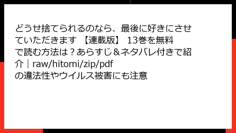 raw/hitomi/zip/pdf/漫画バンクなどの海賊版サイトは、法的・セキュリティ・個人情報・経済的リスクの塊。『どうせ捨てられるのなら、最後に好きにさせていただきます』のような素晴らしい作品を、心置きなく楽しむためには、正規の電子書籍サービスを利用しましょう。無料トライアルやセールも充実しており、安全で高品質です。皆さんの漫画ライフが、トラブルフリーで続くことを願っています! リスクを知って、賢く楽しむ一歩を踏み出してください。