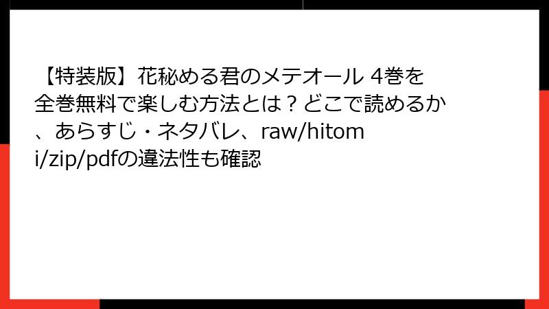 こんにちは、マンガファンの皆さん! 珠森ベティ先生の『花秘める君のメテオール』は、吸血鬼と少女の切ないロマンスが魅力の人気作品。特に【特装版】4巻は、ドラマチックな展開と豪華な特典で話題沸騰中です。しかし、raw、hitomi、zip、pdf、漫画バンクなどの海賊版サイトでこの作品を読むことは、重大なリスクを伴います。この記事では、海賊版サイトを利用することの危険性を、法的、倫理的、技術的な観点から詳しく解説します。好きな作品を安全に楽しむために、ぜひ最後まで読んでください!