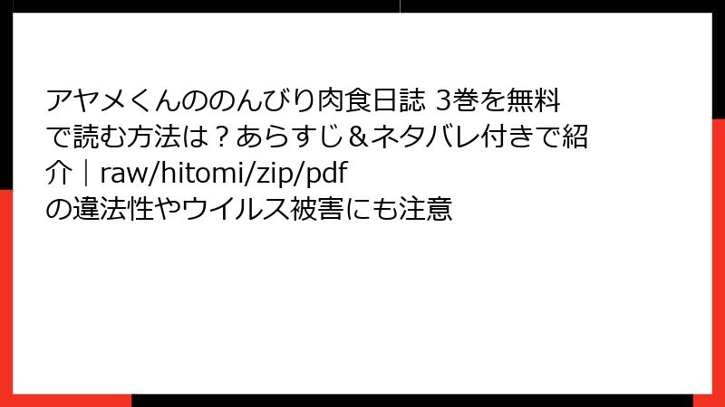 raw/hitomi/zip/pdf/漫画バンクなどの海賊版サイトは、法的罰金、ウイルス感染、経済・倫理的損失のトリプルパンチ。2025年の厳格化トレンドで、利用はますます危険です。『アヤメくんののんびり肉食日誌』の甘いラブコメを、心置きなく楽しむなら正規ルートで! この記事が、少しでも安全意識を高めるきっかけになれば幸いです。コメントであなたの体験談やおすすめ正規サイトをシェアしてくださいね。次回もお楽しみに!