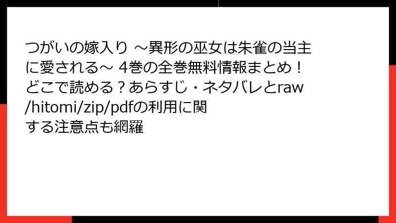 こんにちは、マンガ大好きブロガーの雪見です! 今回取り上げるのは、和風ファンタジーとロマンスが織りなす傑作『つがいの嫁入り ~異形の巫女は朱雀の当主に愛される~』の4巻。この巻は、異形の巫女・銀花と朱雀の血を引く当主・万羽の愛が試される、ドラマチックな展開が話題を呼んでいます。ネットやSNSでのレビュー・口コミ・評判を基に、読者の反応を詳しく分析し、なぜこの作品が多くのファンを魅了しているのかをブログ形式で解説します! 読み応えのある内容にするため、主要な評価ポイントごとに分け、箇条書きや表も活用してまとめました。ネタバレは最小限に抑えますが、気になる方はご注意を。それでは、さっそく見ていきましょう!