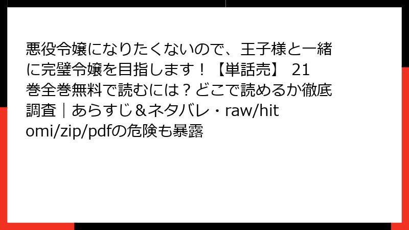 こんにちは、マンガ愛好家のブロガーです! 『悪役令嬢になりたくないので、王子様と一緒に完璧令嬢を目指します!【単話売】』は、乙女ゲーム風の世界観とリズの奮闘が魅力の大人気コミック。単話売りの手軽さで、島田ちえ先生の美しいイラストを堪能できますよね。しかし、raw、hitomi、zip、pdf、漫画バンクといった海賊版サイトでこの作品を読む人が後を絶ちません。これらのサイトは無料で読める一方、重大なリスクが潜んでいます。今回は、海賊版サイトで読むことの危険性を、法的、倫理的、技術的視点から詳しく解説。ブログ記事形式で、読み応えのある内容をお届けします。なぜ正規ルートで楽しむべきか、じっくり見ていきましょう!