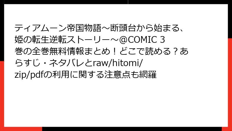 こんにちは、漫画ファンの皆さん! ティアムーン帝国物語~断頭台から始まる、姫の転生逆転ストーリー~@COMICは、ミーア姫のポンコツ逆転劇が魅力の大人気コミックですが、残念ながら「raw」「hitomi」「zip」「pdf」「漫画バンク」などの海賊版サイトで無料で読もうとする人が後を絶ちません。しかし、これらのサイトを利用することは、重大なリスクを伴う行為です。この記事では、海賊版サイトで漫画を読むことの危険性を、法律、倫理、セキュリティの観点から詳しく解説します。読み応えのある内容で、なぜ正規ルートで楽しむべきかを一緒に考えましょう!