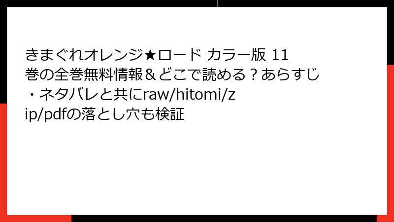 『きまぐれオレンジ★ロード』カラー版11巻は、指定サービスの大半で配信中。レンタル派はRenta!、コスパ派はebookjapan、無料派はピッコマが鉄板です。カラー版の夕陽や浴衣の鮮やかさが、電子書籍でより輝くはず。まずは試し読みから、恭介の優柔不断にイライラしつつ、まどか&ひかるの魅力にハマってください! 皆さんはどのサービス派? コメントでシェアを。次回は全巻セットのコスパ比較かも。お楽しみに!