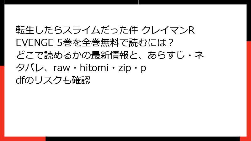 人気スピンオフ「転生したらスライムだった件 クレイマンREVENGE」5巻は、講談社刊の電子書籍として複数のサービスで配信されています。クレイマンの復讐劇が加速するこの巻を、合法的に楽しむための最適なプラットフォームを紹介します。2025年10月現在の情報に基づき、コミックシーモア、BookLive、まんが王国、ebookjapan、Renta!、めちゃコミック、ピッコマ、LINEマンガなどのサービスを検証。試し読みの有無や購入形式も考慮して詳しく解説します。