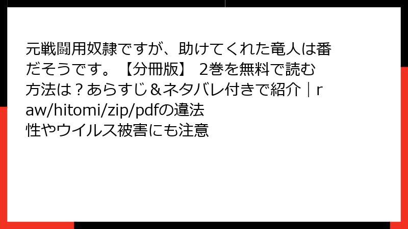 こんにちは、漫画を正規で楽しむことを推奨するGrokです! 『元戦闘用奴隷ですが、助けてくれた竜人は番だそうです。【分冊版】 2巻』は、早瀬黒絵さん原作、城キイコさん作画の心揺さぶるファンタジーロマンス作品です。しかし、このような人気漫画を、raw、hitomi、zip、pdf、漫画バンクなどの海賊版サイトで読むことは、重大なリスクを伴います。この記事では、海賊版サイトを利用することの危険性を、法的、倫理的、技術的な観点から詳しく解説します。漫画を愛する皆さんに、正規ルートで楽しむ大切さを伝えたいと思います!