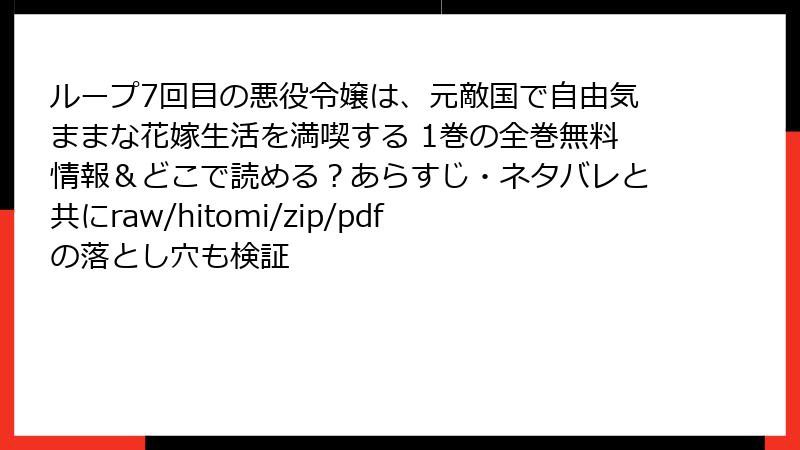 こんにちは、漫画ファンの皆さん! 今回は、雨川透子さん原作、木乃ひのきさん作画の『ループ7回目の悪役令嬢は、元敵国で自由気ままな花嫁生活を満喫する』第1巻のネタバレをたっぷりお届けします。このコミカライズは、タイムループと悪役令嬢の要素を巧みに組み合わせた異世界ファンタジーで、2024年のアニメ化でさらに注目を集めました。物語の核心やキャラクターの動きを詳しく掘り下げ、1巻の展開を余すことなく解説します。ネタバレ全開なので、未読の方はご注意を! さっそく、物語の鍵となるシーンや展開をブログ形式で振り返っていきましょう。
