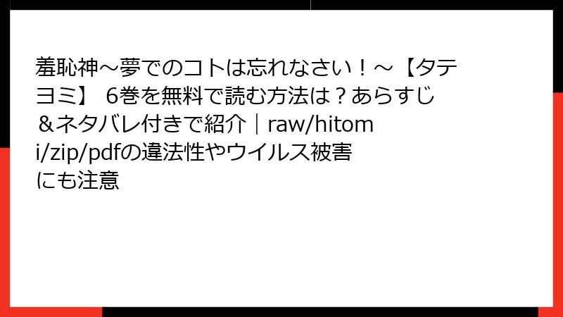 『羞恥神~夢でのコトは忘れなさい!~【タテヨミ】』6巻は、縦読み形式のラブコメ漫画として、LINEマンガを中心に多くの読者から注目を集めています。夢と現実が交錯するユニークな設定と、主人公たちのドキドキする関係性が話題に。この記事では、6巻に対する読者のレビューや口コミ、評判を詳しく掘り下げ、作品の魅力とファンの反応を紹介します。