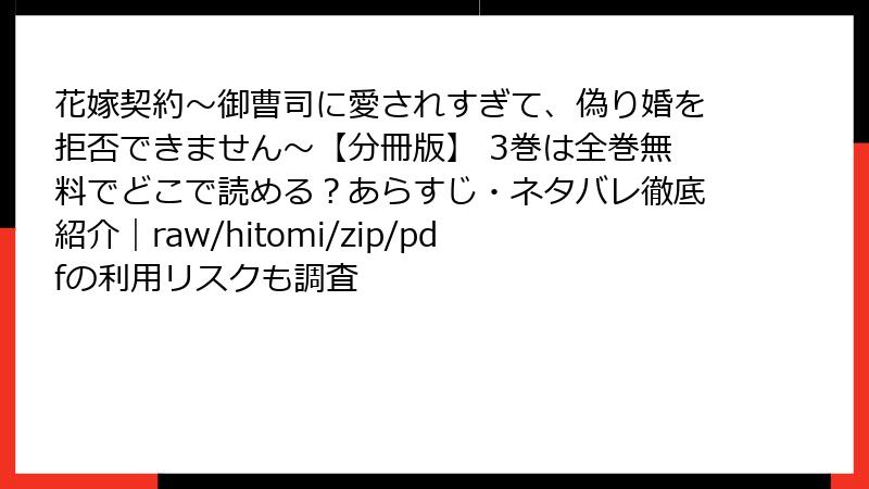 こんにちは、漫画愛好家の皆さん! ブログ管理人のみゆきです。今日は、誰もが一度は心惹かれる「無料で最新漫画を読みたい」という誘惑について、真剣に語ります。具体的には、『花嫁契約~御曹司に愛されすぎて、偽り婚を拒否できません~』のような人気作を、raw、hitomi、zip、pdf、漫画バンクなどの海賊版サイトで読むことのリスクを、2025年現在の最新情報に基づいて詳しく解説します。一見便利に見えるこれらのサイトですが、法的・セキュリティ・倫理的な落とし穴が満載。軽い気持ちでアクセスすると、後悔の連続になる可能性大です。この記事では、複数の視点からリスクを深掘りし、安全な代替手段も提案。読み終わったら、正規ルートを選ぶきっかけになれば嬉しいです! それでは、さっそく本題へ。