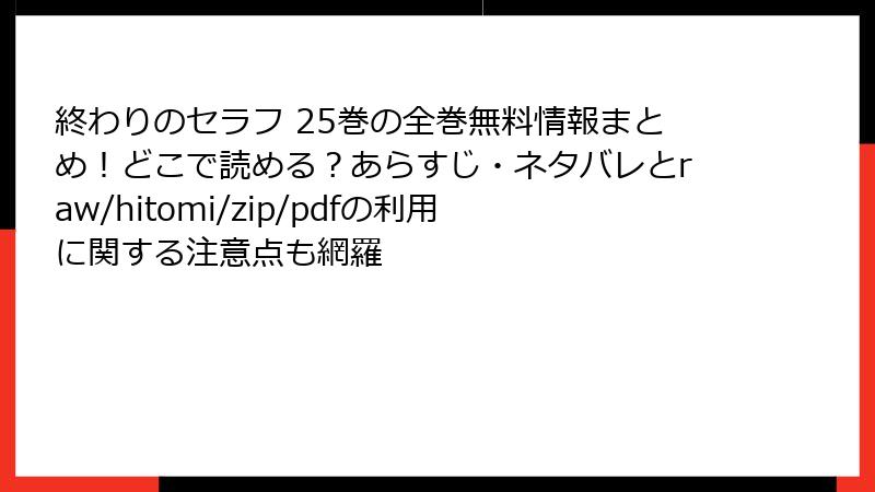 めちゃコミックは『終わりのセラフ』のエピソード配信に強く、48話無料などのキャンペーンを実施中。1話30ポイントから読め、25巻相当の後半部分も順次配信されますが、全巻一気読みには不向き。縦スクロール読みが快適で、日常的に少しずつ進めるファン向けです。