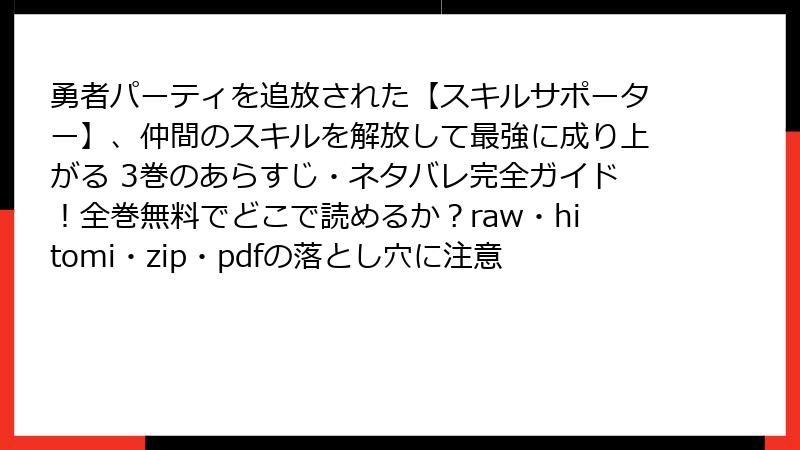 『勇者パーティを追放された【スキルサポーター】、仲間のスキルを解放して最強に成り上がる』3巻は、主人公アルスの成長と新たな挑戦が描かれる、物語の転換点ともいえる巻です。この記事では、3巻の主要なネタバレ情報を詳しく解説し、物語の核心やキャラクターの動きを深掘りします。以下、ストーリーの重要な展開を章ごとに整理し、読み応えのある内容でお届けします。※ネタバレを含むため、未読の方はご注意ください。