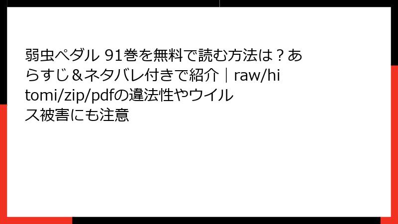 こんにちは、漫画好きの皆さん! 『弱虫ペダル』のような熱血スポーツ漫画を無料で読みたい気持ち、わかりますよ。渡辺航先生の作品は、毎巻のレースシーンがアドレナリン全開で、つい最新話を待ちきれなくなりますよね。でも、raw、hitomi、zip、pdf、漫画バンクなどの海賊版サイトで手に入れようとすると、思わぬ落とし穴が待っています。この記事では、そんな海賊版サイトの利用リスクを、法的・セキュリティ・倫理的な観点から詳しく掘り下げます。無料の誘惑に負けず、安全に楽しむためのヒントもお届けします。まだ利用を考えている方は、ぜひ読み進めてください!