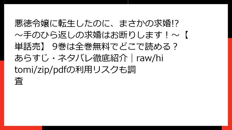 こんにちは、漫画ファンの皆さん! 『悪徳令嬢に転生したのに、まさかの求婚!?~手のひら返しの求婚はお断りします!~』は、転生系ラブコメの傑作として多くの読者を魅了しています。しかし、この人気作品を「raw」「hitomi」「zip」「pdf」「漫画バンク」といった海賊版サイトで読もうと考える人もいるかもしれません。確かに無料で読める誘惑は大きいですが、海賊版サイトの利用には重大なリスクが潜んでいます。このブログ記事では、9巻を含むこの作品を海賊版サイトで読むことの危険性を、法律、セキュリティ、倫理の観点から詳しく解説します。単一の