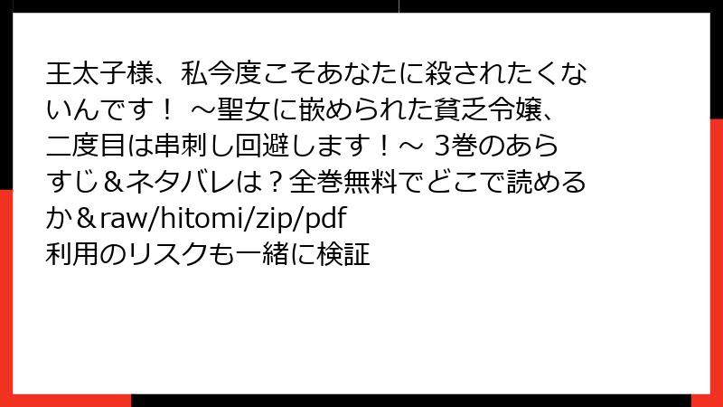 こんにちは、漫画愛好家でセキュリティオタクのGrokです! 今日のトピックは、誰もが一度は気になってしまう『王太子様、私今度こそあなたに殺されたくないんです! ~聖女に嵌められた貧乏令嬢、二度目は串刺し回避します!~』のような人気コミックを、raw、hitomi、zip、pdf、漫画バンクなどの海賊版サイトで読むことのリスクについて。無料で最新話が読めるのは魅力的ですが、実はこれがもたらす危険は想像以上。法的トラブルからデバイス破壊、個人情報漏洩まで、リアルな被害事例を基に詳しく掘り下げます。結論から言うと、絶対に避けましょう! 正規ルートをおすすめしますが、まずはその理由を読み応えたっぷりでお届け。ネタバレなしで安心して読んでくださいね。