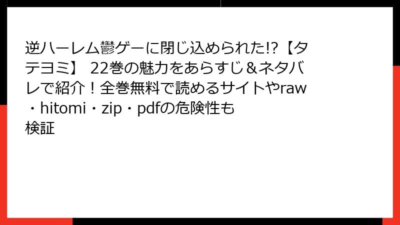 こんにちは、漫画愛好家の皆さん! ブロガーとして、毎日さまざまな作品に触れていますが、今日のテーマはちょっとシリアス。人気の逆ハーレム鬱ゲーに閉じ込められた!?【タテヨミ】のような魅力的な漫画を、raw、hitomi、zip、pdf、漫画バンクなどの海賊版サイトで読むことのリスクについて、徹底的に掘り下げます。2025年現在、これらのサイトは「無料で最新話が読める!」という甘い誘惑でユーザーを引きつけますが、その裏側には法的・セキュリティ・倫理的な落とし穴が満載。軽い気持ちでアクセスすると、後悔の連続になるケースが急増中です。このブログ記事では、複数の視点からリスクを詳しく解説し、安全な代替手段も提案。読み応え抜群の内容で、皆さんの漫画ライフを守るお手伝いをします! ネタバレなしでリスクだけにフォーカスなので、安心してどうぞ。
