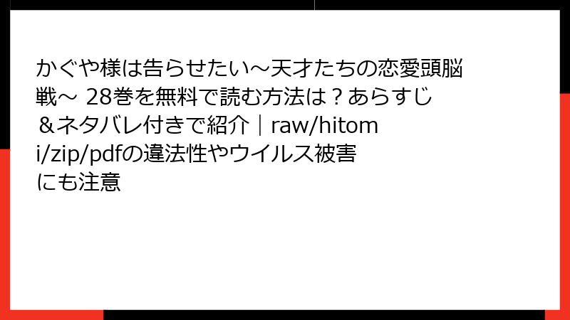 みなさん、こんにちは! 漫画好きのブロガー、かぐやファンです。『かぐや様は告らせたい』のような人気作を無料で読みたい気持ち、わかります。でも、raw、hitomi、zip、pdf、漫画バンクなどの海賊版サイトに手を出していませんか? これらのサイトは一見お得に見えますが、実は法的な罰則からサイバー攻撃、経済的損失まで、さまざまなリスクが潜んでいます。今回は、そんな海賊版サイトの危険性を、具体的な事例を交えながら詳しく解説。読み終わったら、正規ルートで楽しむ重要性がきっと実感できるはずです。ブログ記事風に、じっくりお届けします!