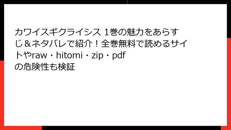 こんにちは、漫画愛好家の[架空の名前]です! 『カワイスギクライシス』は、城戸みつる先生による大人気のSFコメディ漫画で、地球の可愛い動物たちに翻弄される宇宙人のドタバタが魅力ですよね。そんな大好きな作品を、つい「無料で読みたい」と思う気持ちも分かりますが、raw、hitomi、zip、pdf、漫画バンクなどの海賊版サイトを利用することは、重大なリスクを伴います。この記事では、海賊版サイトで『カワイスギクライシス』を読むことの危険性を、法的・倫理的・技術的な観点から詳しく解説します。単なる「無料」では済まされない問題を、