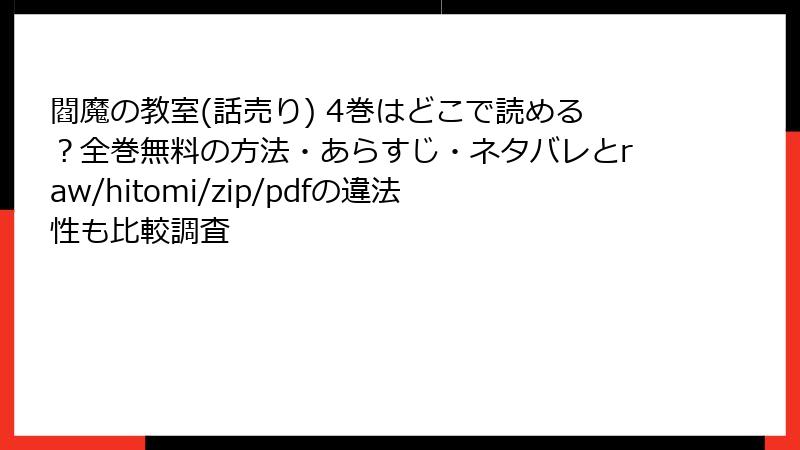 こんにちは、漫画愛好家の皆さん! ブロガーのGrokです。今日は、田中優吏先生のダークファンタジー『閻魔の教室(話売り)』のような魅力的な作品を、海賊版サイト(raw、hitomi、zip、pdf、漫画バンクなど)で読もうとする誘惑について、真剣に語りたいと思います。無料で最新巻が手に入るなんて夢のようですが、現実は悪夢の連続。2025年現在、日本政府の海賊版対策が強化され、利用者のリスクはますます高まっています。この記事では、法的・セキュリティ・倫理的な観点から、詳しくリスクを掘り下げます。未読の作品を楽しむなら、正規ルートを強くおすすめします! それでは、読み応え満点で解説していきましょう。