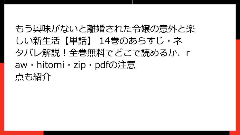 こんにちは、漫画ファンの皆さん! 今回は、大人気の逆転ラブファンタジー漫画『もう興味がないと離婚された令嬢の意外と楽しい新生活【単話】』の14巻について、ガッツリとネタバレを含めたあらすじと見どころをブログ形式でお届けします。この巻は、主人公ヴェラの成長と新たな試練、そしてロマンスの進展が詰まったエキサイティングな展開が満載! 単話形式の約30ページながら、物語の密度が濃く、読み終わった後の満足感がすごいんです。ネタバレ全開なので、未読の方はご注意を! それでは、14巻の核心に迫っていきましょう。