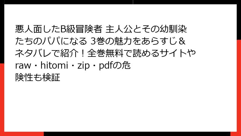 こんにちは、漫画ファンの皆さん! 『悪人面したB級冒険者 主人公とその幼馴染たちのパパになる』は、グレイとその家族の心温まる物語が魅力の人気コミックですが、残念ながら、raw、hitomi、zip、pdf、漫画バンクといった海賊版サイトでこの作品を無料で読もうとする動きが見られます。しかし、これらのサイトを利用することは重大なリスクを伴います。この記事では、海賊版サイトで漫画を読むことの危険性を、法律、倫理、技術的な観点から詳しく解説します。単一の