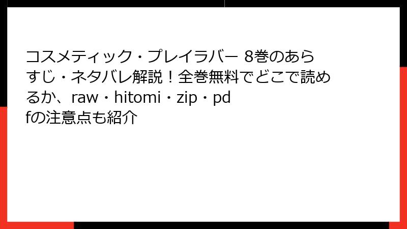 rawやhitomi、漫画バンクなどの海賊版サイトは、魅力的に見えて多大なリスクを孕んでいます。法的罰則、ウイルス感染、プライバシー侵害、倫理的問題…これらを避けるためにも、正規サービスを利用しましょう。おすすめは、無料試し読み豊富な電子書籍ストアや、公式アプリ。初月無料キャンペーンを活用すれば、コストゼロで楽しめます! 『コスメティック・プレイラバー』も、公式でサポートすれば続きが安心して読めますよ。