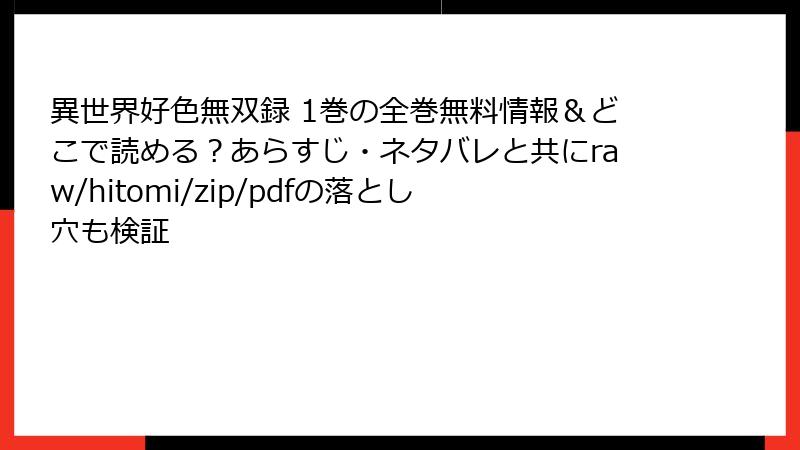 こんにちは、漫画愛好家の皆さん! 今日のトピックは、講談社から出ているエロティックな異世界ファンタジー『異世界好色無双録 1巻』のような人気作を、raw、hitomi、zip、pdf、漫画バンクなどの海賊版サイトで読むことのリスクについて。無料で手軽にアクセスできる魅力はわかりますが、2025年現在、これらのサイトは法的・セキュリティの地雷原。利用者の被害事例が急増中です。この記事では、多角的にリスクを深掘りし、安全な代替を提案します。ネタバレなしで、漫画の魅力を損なわず守るためのガイドとしてお読みください!